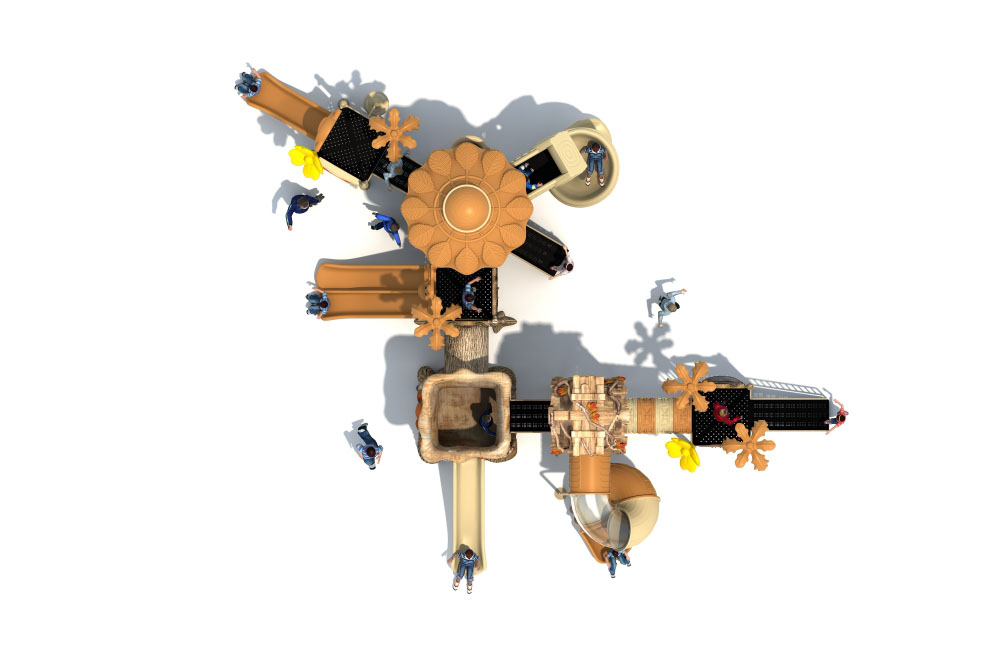 • 远古部落系列虽然名字带着“古”字,但是在设计细节处无不透露着艺术与创造性。当孩子在仿真树中探索、冒险、嬉戏游玩时,就像穿越到古老的神秘森林;粗略的树干包围着他们,头顶是高耸的茅草屋,触感真实的枯枝走廊,还有随处可见的小动物们…… 远古部落系列旨在打造区别于其他系列带给孩子们的新鲜感,让孩子们找设计者打造的神秘世界中获得冒险的乐趣。