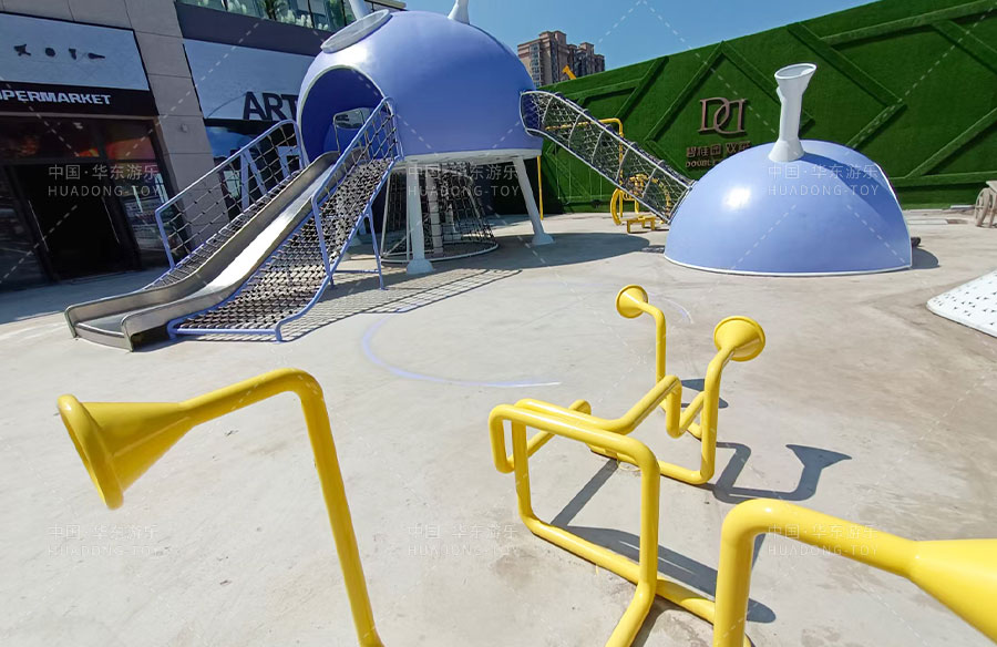 此次项目采用的是乐鱼官方游乐自主设计的飞碟主题的游乐设备,新增了传声筒、爬网、儿童秋千、钻洞、不锈钢滑梯等功能。